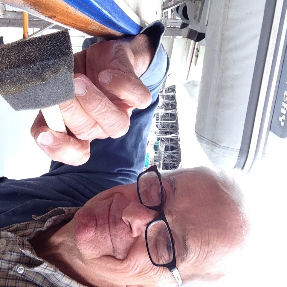 Some summer I’m having. Here I am, on hands and bony knees (ouch!) refinishing a teak sink cabinet on the aft deck of my Grand