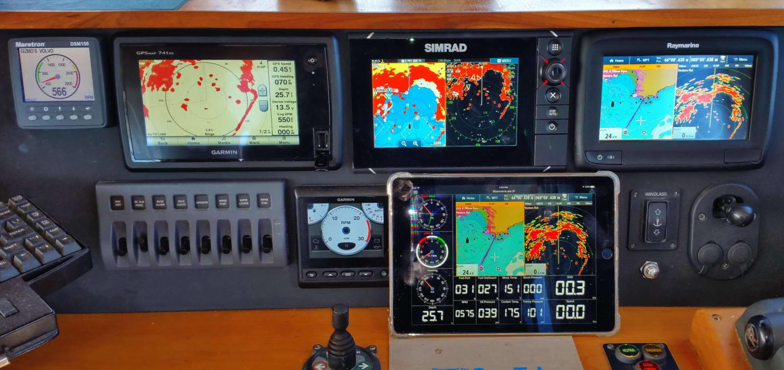 Hey, those are all solid-state radomes showing on the 7-inch displays at Gizmo’s lower helm, and you’d see a fourth one running on the flybridge.