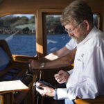 Capt. Pike testing the sound levels and running speeds of the new Grand Banks 60.