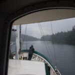 Unfortunately, some hours after we set out for Queen Charlotte City, the wind in Amentieres began to rise, reaching a sustained 20 knots with gusts to 50. Our quiet anchorage, protected from the open ocean by a series of peaks, somehow allowed wind to sneak past and into our quiet little bay. As the wind increased Explorer began to sail on her anchor. Then, when she was almost abeam to the wind, a 50-knot gust hit her ample sail area broadside and ripped her anchor from the ground. Our two-man crew, enjoying a quiet day of reading, noticed not only the violent gust but also that the landscape outside was changing with unusual speed. A check of the chartplotter confirmed they were indeed adrift and moving toward shore at about two knots. They were faced with two options: let out more rode and hope the anchor would reset or haul in the anchor, reposition, and re-anchor. Given the blustery conditions and uncertainty of achieving a dependable reset, Dave and Mike wisely chose the latter. Starting the engine and hauling in the anchor, they were able regain control of the boat. This they did efficiently, and, given the conditions, opted to remain underway until the captain returned to his vessel. The next four hours were spent in a holding pattern, slowly circling in front of the west entrance of the Skidegate Narrows. And that’s where I found them, calm, and perhaps just a little bored, some four hours later.