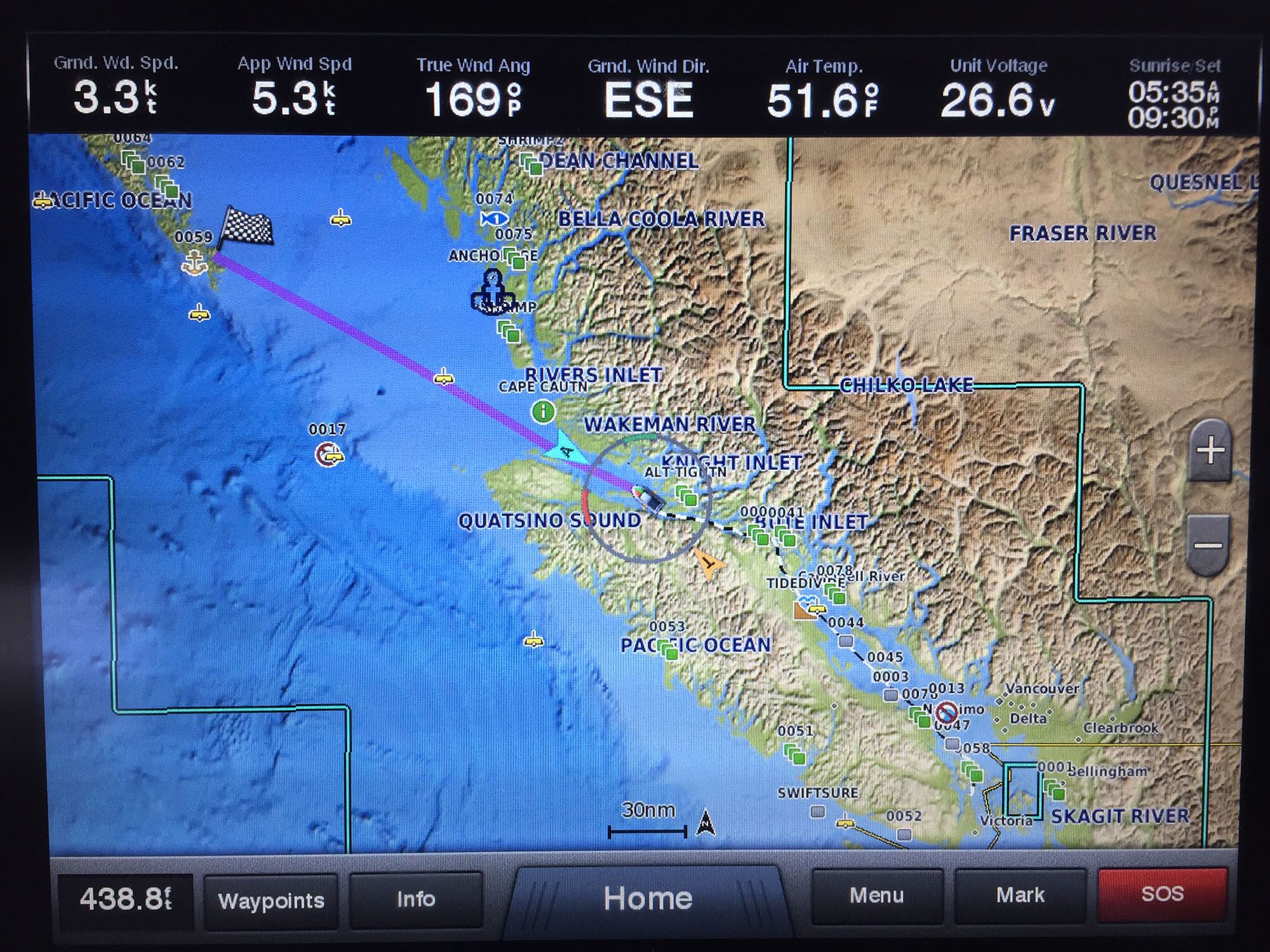 It was clear to us that evening that conditions for such a crossing were excellent. In fact, conditions would likely never be better than those forecast for the next 48 hours. If we were willing to make a 26-hour nonstop run, this window would allow us to get to Haida Gwaii several days earlier than anticipated. The weather also provided a further incentive to change our route: If we missed the opening, then not only would the gale force storm to follow add days to our travel up the inside, but that travel would at best be uncomfortable and might require us to ride out the worst of the storm in a protected anchorage. I laid in our new course on the chartplotter before making an early night of it. At 8 a.m., with the sun well up on our starboard side, we weighed anchor.