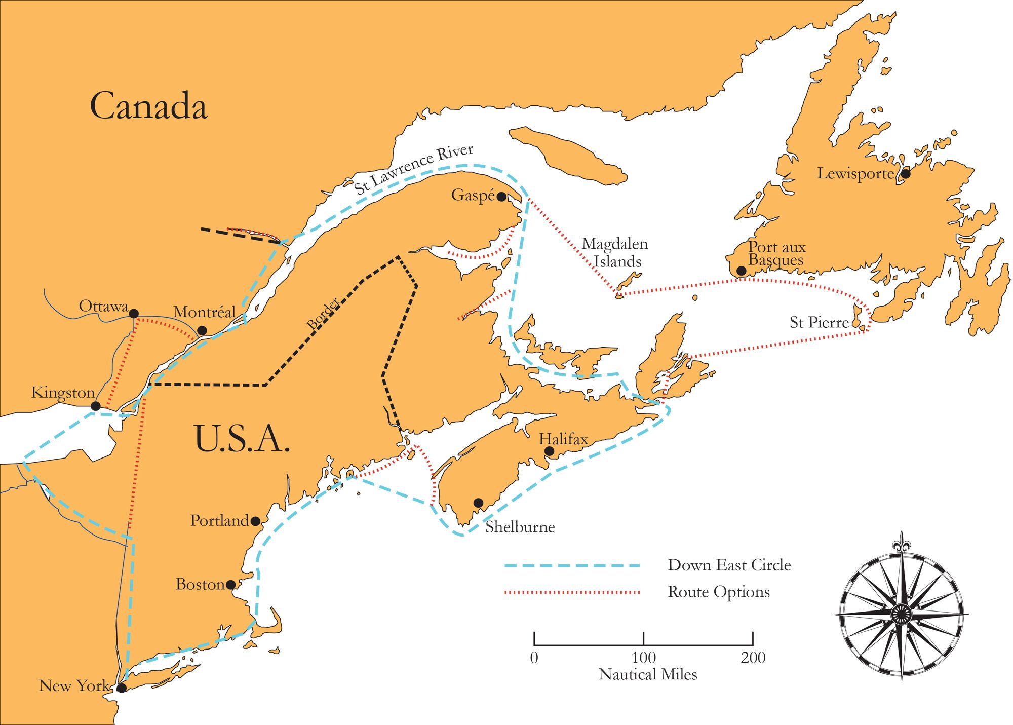 To some, the term “Down East” means “blue water,” but the Down East Circle Route is in no way a bluewater trip. Land is always in sight and you’ll never be more than a half day from the nearest port or anchorage. The 2,400-nautical-mile route loops around New England and among the islands of the Canadian Maritimes, reaching its northernmost point, the Gaspé Peninsula, at nearly 50 degrees latitude.