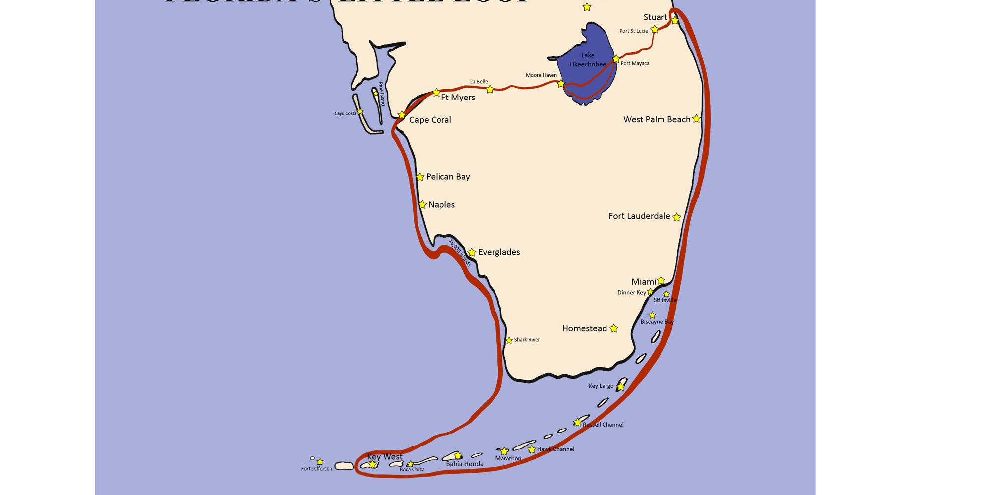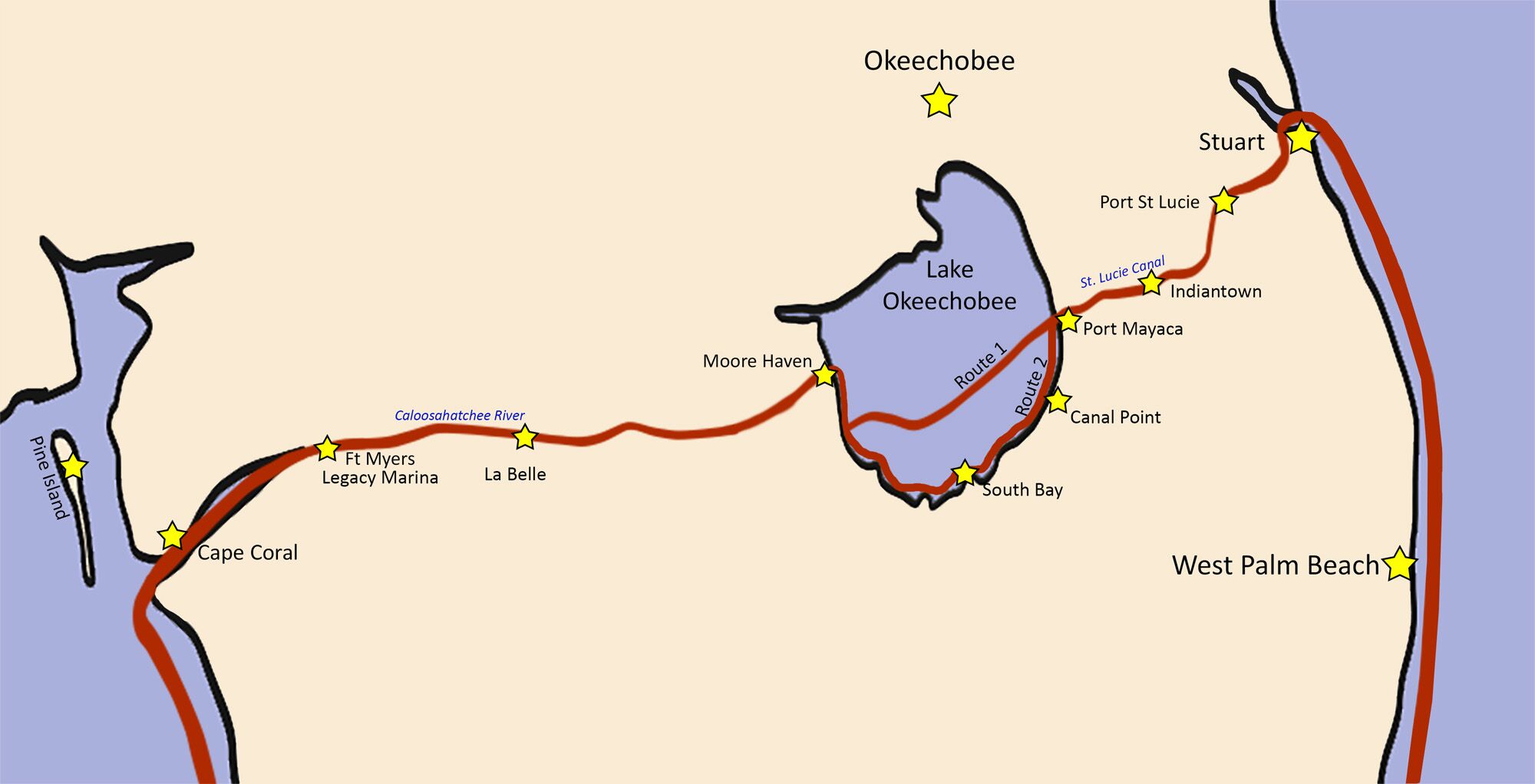 Looping around South Florida was not possible until the Okeechobee Waterway (OWW) was created in 1937, cutting a route through the center of the state. This project connected Lake Okeechobee (the second largest lake contained wholly in the U.S.) to both coasts by channelizing the St. Lucie River on the east and the Caloosahatchee River on the west and adding five locks and dams, maintained by the Army Corps of Engineers. This 117-mile route opened a more efficient shipping route, allowing product to be moved across the state without ships going all the way around the Florida Keys.