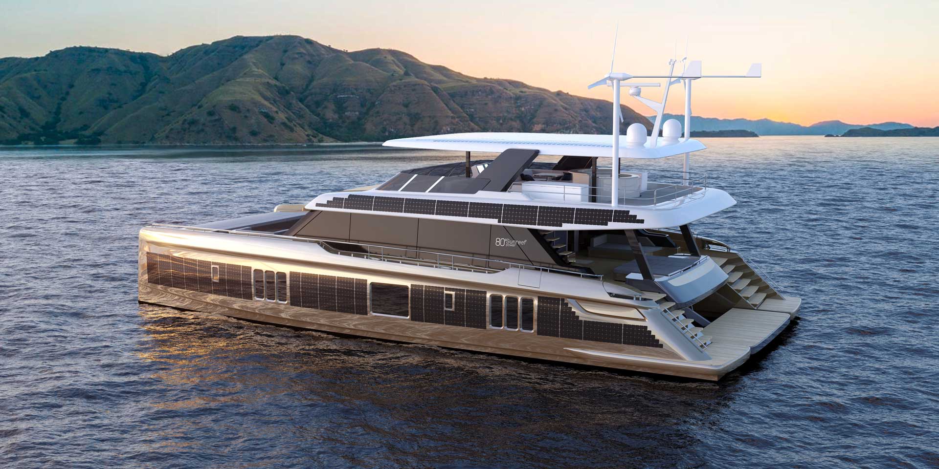 This Polish power cat is fitted with over 2,000 square feet of photovoltaics via its proprietary “solar skin” and can be built with either hybrid or fully electric propulsion.