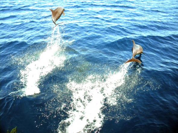Then we saw dolphins by the hundreds, as we did every day thereafter. This dolphin army cavorted all around us, many launching themselves high out of the water to get a better look at us. By the dozen, they took turns rubbing their backs against the water displaced by our bows. They seemed genuinely happy to see us, unlike their Floridian cousins, who seem to have become indifferent to the presence of humans.