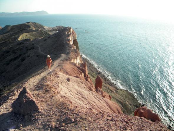 Despite our unfamiliar surroundings, and whatever my earlier musings might have suggested, the crew of Costa Baja 1 felt totally tranquilo while underway. Sitting on the flying bridge, we felt any lingering tension dissipate as if we had just exhaled a deep breath. We were in the shade, and though landward it may have been 100 degrees, our own apparent wind, added to a few knots of northeasterly breeze, kept us cool. We glided into Puerto El Gato, at 4 pm and anchored near the bay’s most distinguishing feature, a rock slope that looked like giant toes molded from red clay, left out in the rain, then baked.