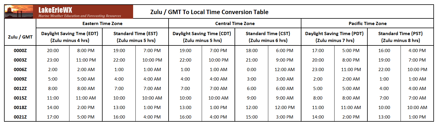 In order to use forecast products based on Zulu, you’ll need to convert from Zulu to your local time. Fortunately, converting is easy once you know the time difference (time zone offset) between your location and Greenwich, England. If you live in the Eastern Time zone, subtract four hours from Zulu to arrive at your local time. Residents in the Central Time zone must subtract five hours. For example, 1200Z is 8:00 am Eastern and 7:00 am Central Time. When Daylight Saving Time is not in effect, an additional hour must be subtracted — 1200Z is 7:00 am Eastern. Table 1, below, shows Zulu-to-local-time conversions for the Eastern, Central, and Pacific Time zones (click here for a larger version).