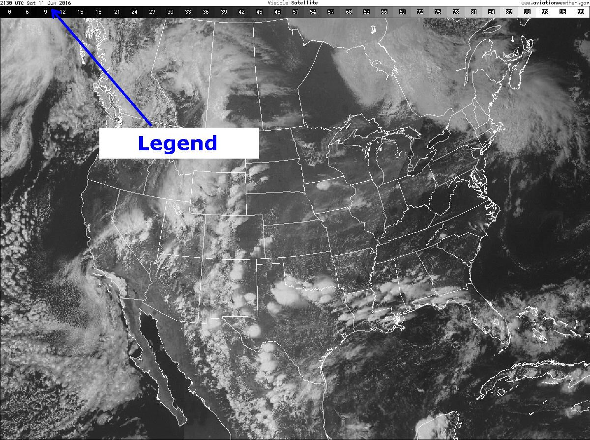 Satellite Imagery: Satellite imagery, particularly visible and infrared, can help a weather-savvy boater assess cloud coverage or the extent of severe weather. Most websites update satellite images every 30 to 60 minutes. Since conditions can change dramatically between updates, it is prudent to determine the age of the image by comparing the image’s time stamp to the current time. The sample visible image (Figure 2) was published at 2130 UTC (same as Zulu) on June 11, 2016.