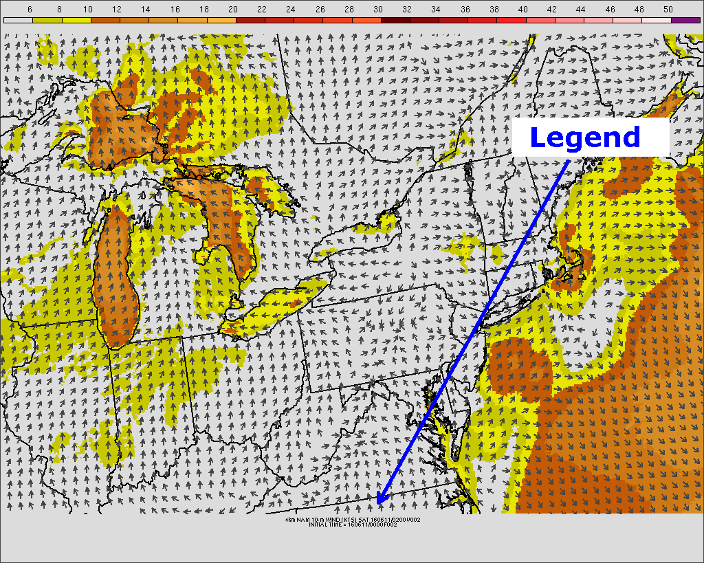 The first half of the first line “4km NAM 10-m Wind (KTS)” indicates the image was produced by the NAM forecast model, and has a horizontal resolution of 4 kilometers (smaller resolution is better). The image is a forecast for winds at a height of 10 meters (this is standard) and the units are in knots. The second half of the line “SAT 160611/0200V002” indicates the forecast was valid at 0200Z on Saturday, June 11, 2016. The “V002” indicates the forecast was valid 2 hours after it was initialized. The second line indicates the forecast was initialized, or processed, at 0000Z on June 11, 2016.