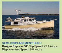 Maximum speeds for displacement hulls are determined by this formula: the square root of the waterline (not overall) length multiplied by 1.34. Generally speaking, the resulting number is the fastest in knots a displacement hull can go, regardless of the amount of horsepower applied to it. So if you have a displacement hull with a waterline length of 36 feet, its maximum speed is 8.04 knots. (6 x 1.34 = 8.04) Add more horsepower, and you’re basically just pushing water ahead of the boat. As you increase waterline length, you also increase the potential top speed, which is why multihulls and boats with bulbous bows are able to go faster than simple monohull displacement boats.