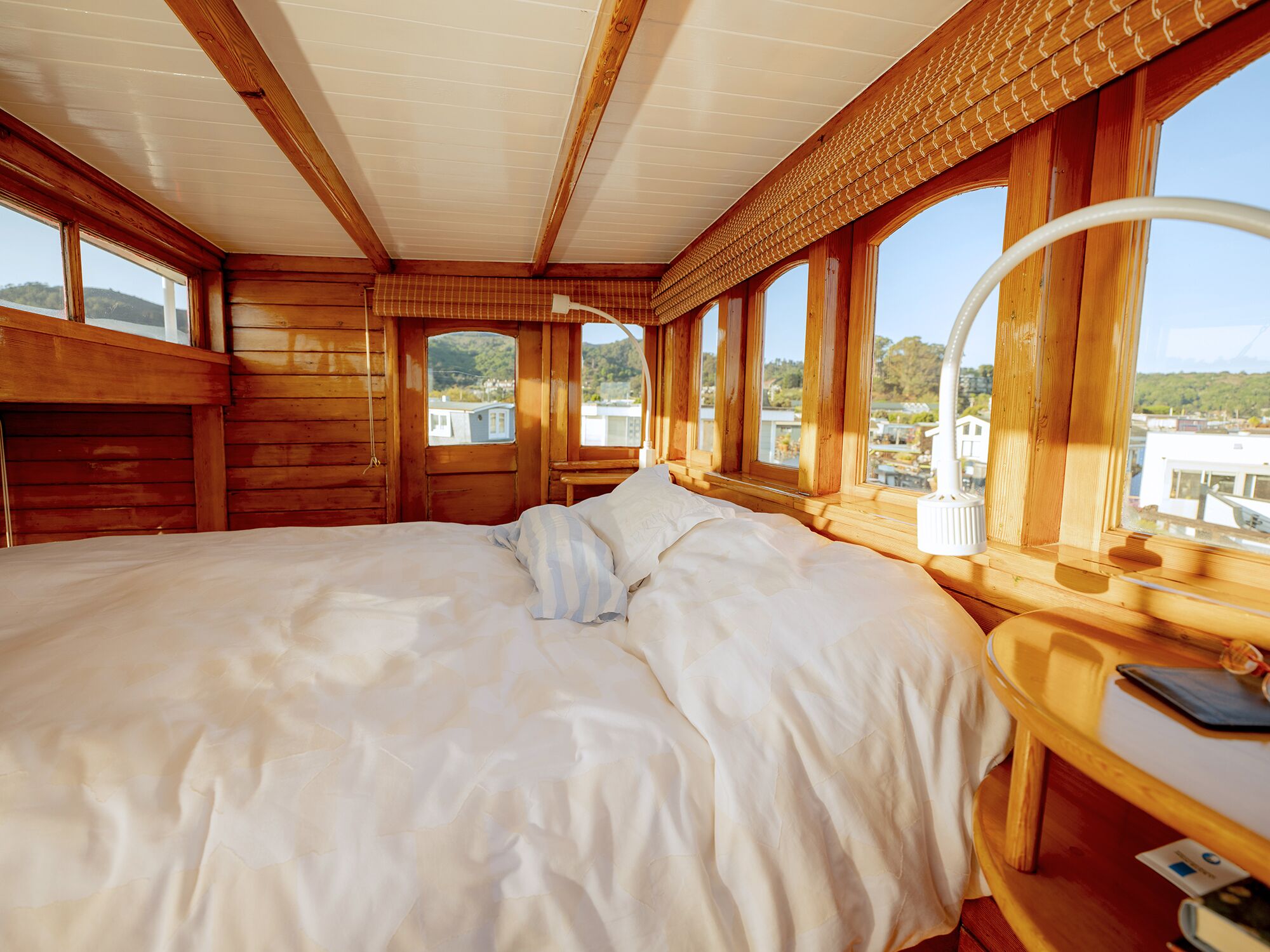 Photo: Cayce CliffordIn a conversion, the engine room (with a taller ceiling) became the salon, and the pilothouse was redone as a stateroom, shown below.