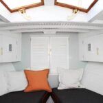 He removed a plywood bench and stainless-steel railings on the cabin roof that were not original to the boat. He reversed the swing on the pilothouse doors and converted them to Dutch doors, so the bottoms could be closed while the tops could swing open to ventilate the pilothouse. The heads and galley got striped sapele countertops with new sinks and faucets. The galley also got a built-in microwave.