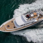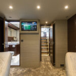 Because this is a semi-custom yacht, owners can dictate quite a bit of the layout. A cabin aft in the lazerette is designated for crew, but it’s optional, and the space could be used as toy and bicycle stowage. Access to the lazerette and engine compartment is from the cockpit, where seating and sunpads offer relaxation space in the shade.