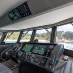Looked at from the outside, the Hardy 65 has sloping wheelhouse windows that create a functional, purposeful look, and the teak decking adds a note of quality. That combination of traditional seagoing elements and modern niceties continues at the main helm station, where the steering wheel is amid the latest helm displays. Secondary displays are in the pelmet above the forward windows, in view of the captain’s chair and companion seating.