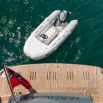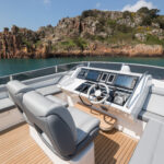 Sun is in full supply up on the flybridge. Aft, there is space for a tender and crane. Dining and barbecue areas, plus sunpads and guest seating, are forward near the helm, with a commanding view of everything around.