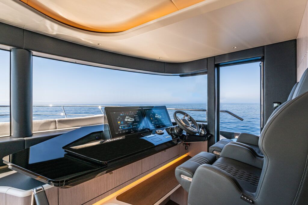 The latest little ship, the Navetta 62, made her world premiere at the Cannes Yachting Festival. She’s as stylish as her brethren, with a plumb bow and large hullside windows flanked by traditional round portlights. Her superstructure appears to be mostly glazing, with forward-facing, vertical glass and side windows supporting a ribbon of white fiberglass and the raked flybridge hardtop. She cuts a fine profile.