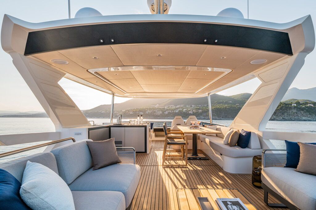 I approached her while she was docked stern-to at the quay. A glass balustrade flanks her after section, with teak-clad stairs from the hydraulic swim platform to the cockpit. The portside stairs have a butterfly-style hatch that grants access below to the crew quarters and engine room.