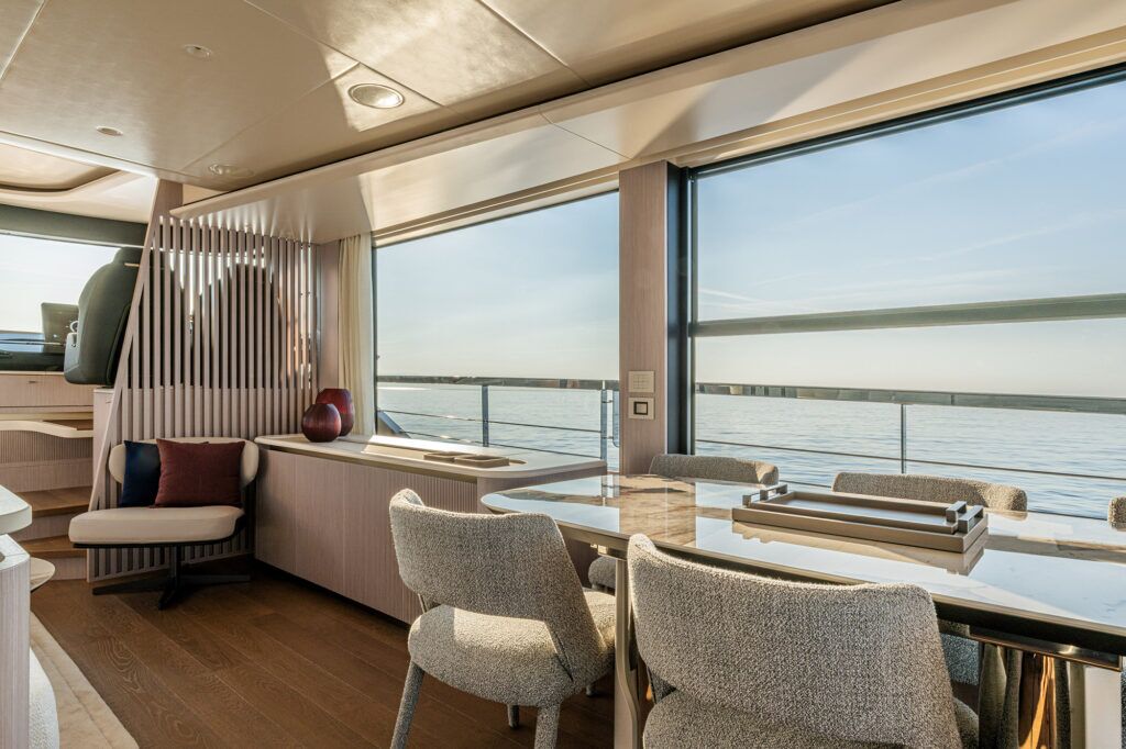 Her contemporary ambience flows on that same level into the salon. The color palette here is subtle and refined, with light soft goods and wide-plank wood soles that echo her teak decks. A low-slung, C-shape settee is forward of the portside galley and dinette. With the helm to starboard a few steps up, the entire salon gives the impression of a sunken gathering area, further enhanced by windows with unobstructed views from every seat. A clever, slatted bulkhead separates the twin Aras Italia helm seats from the leisure spaces.