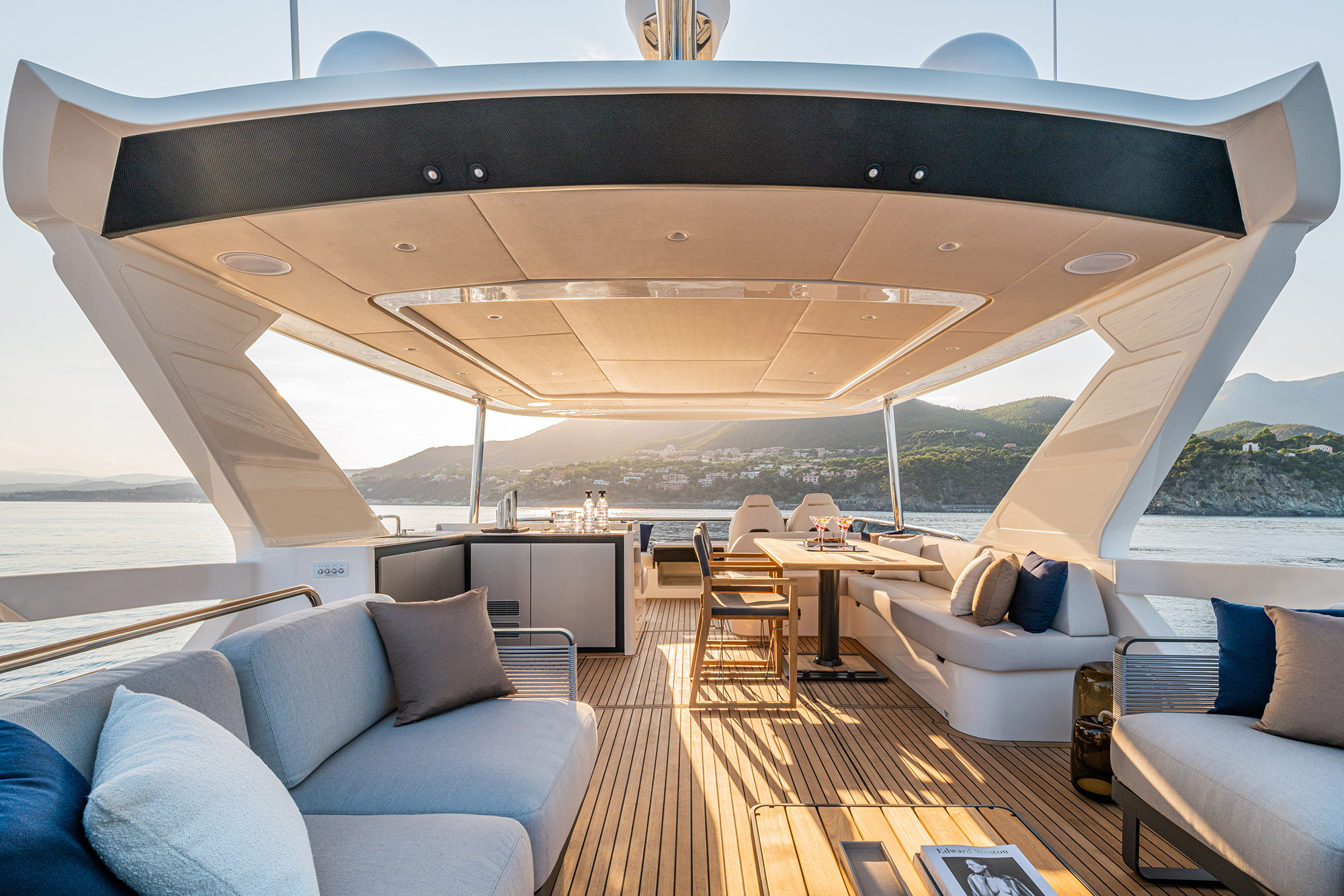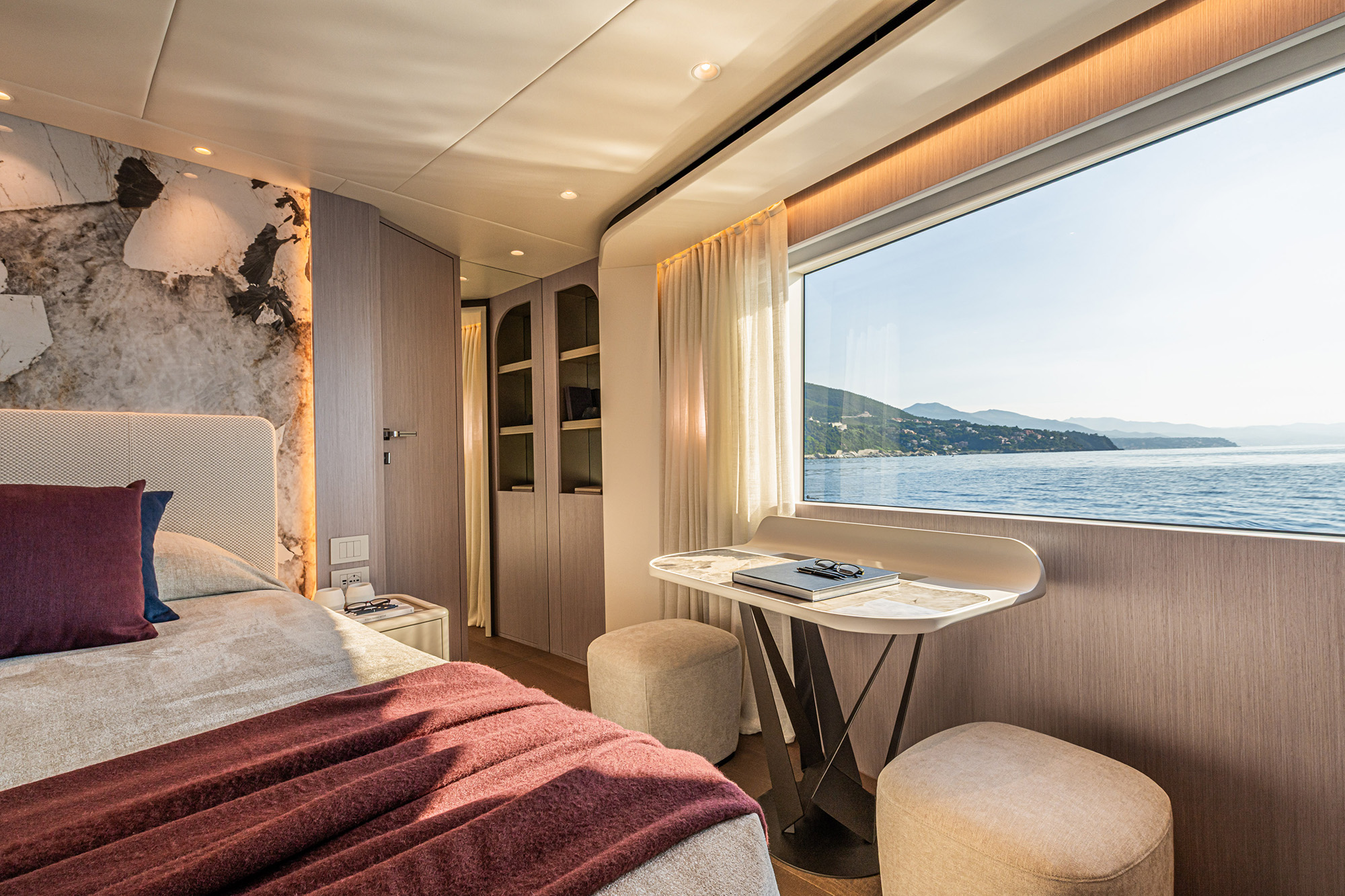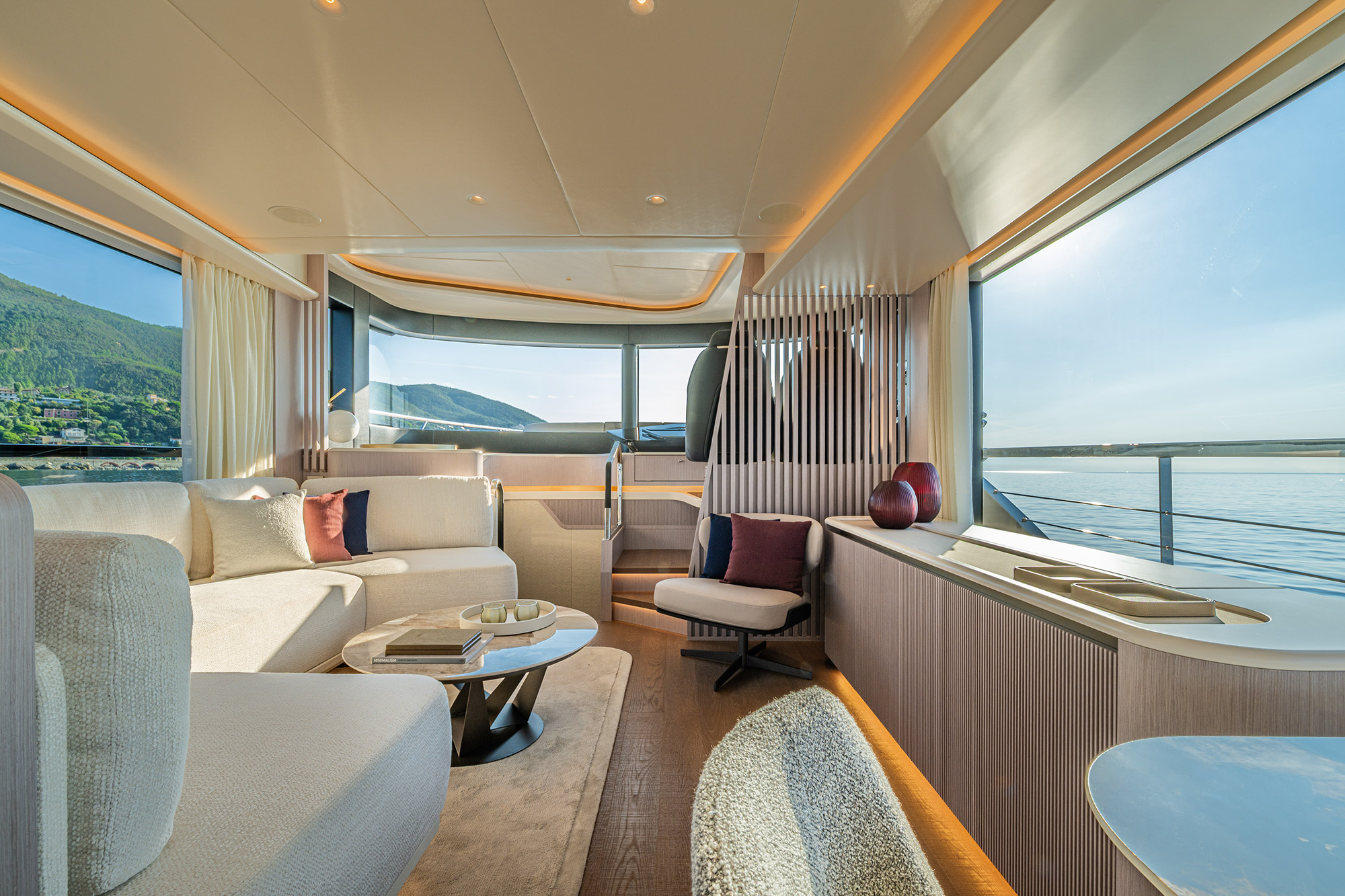 In the cockpit, freestanding furniture and recessed lighting create an aura that made me want to pull up a seat at the wet bar—a pod-shaped affair with an organic, textured finish in clever contrast to the teak sole and muted color palette—and make myself a Negroni. A wing station is built into the bar top, and a retractable shade extends to cover the entire space.