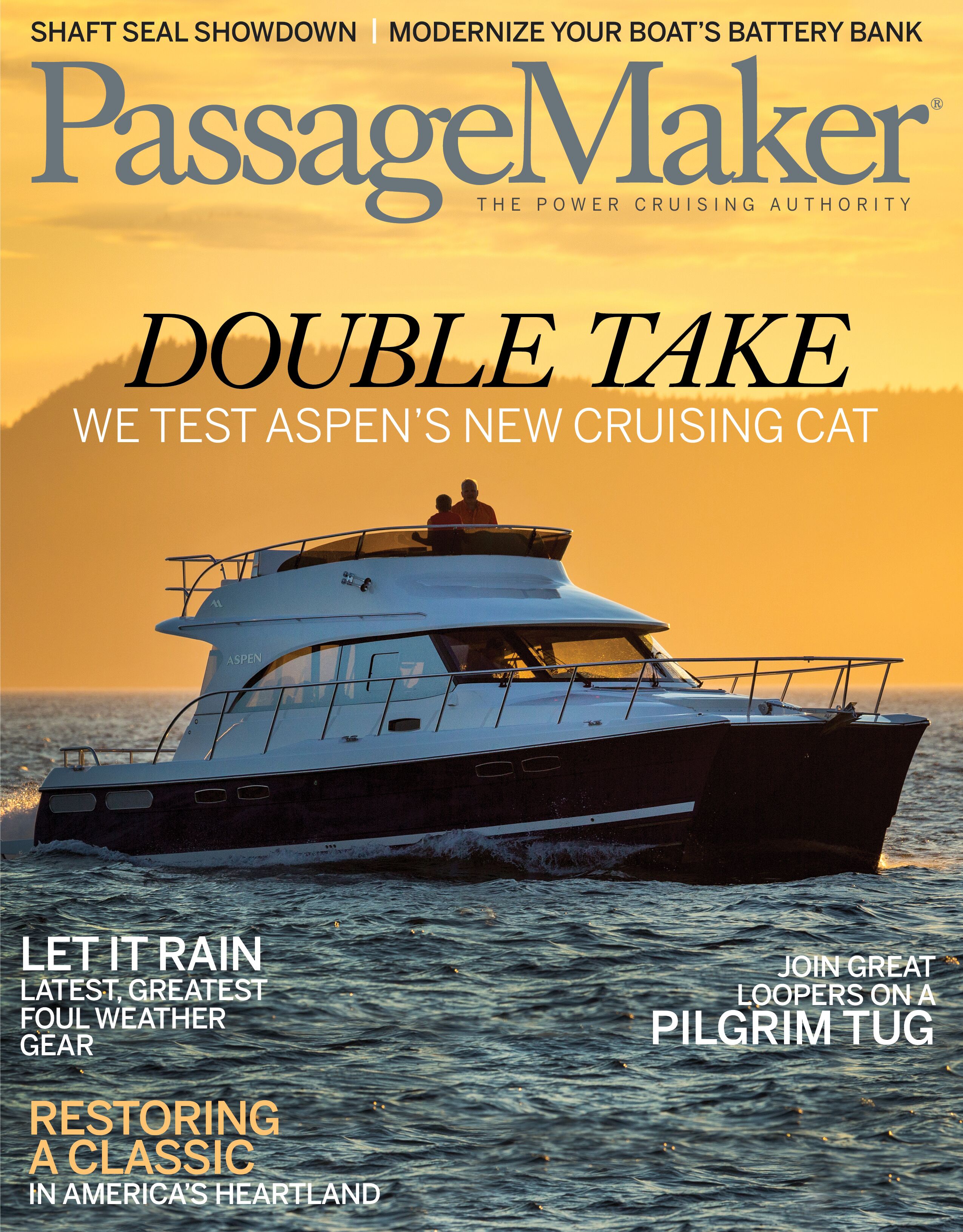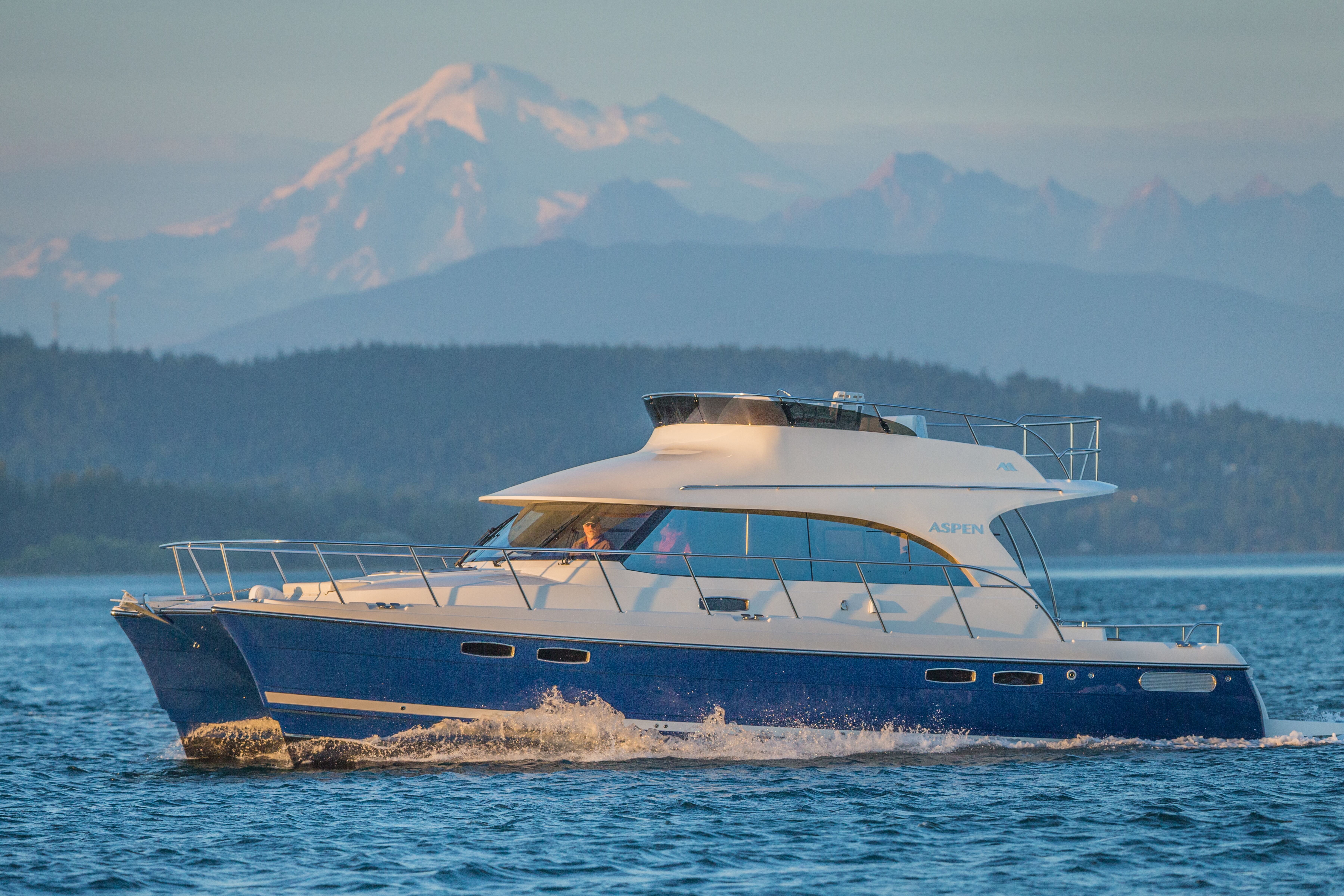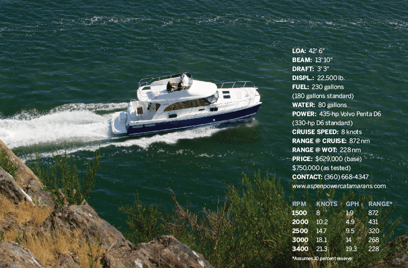 The bow pitched upward as we passed through a ferry wake at 16 knots on our way from Anacortes, Washington, to Friday Harbor. I subconsciously braced for impact, but it never came. “This is the only boat on the market with a built-in suspension system,” explained Larry Graf, who founded Aspen Power Catamarans in 2008. Cruising through a confused chop of 2 to 3 feet, the Aspen C120 didn’t pound, pitch, or roll. In fact, her ride was eerily smooth and quiet.