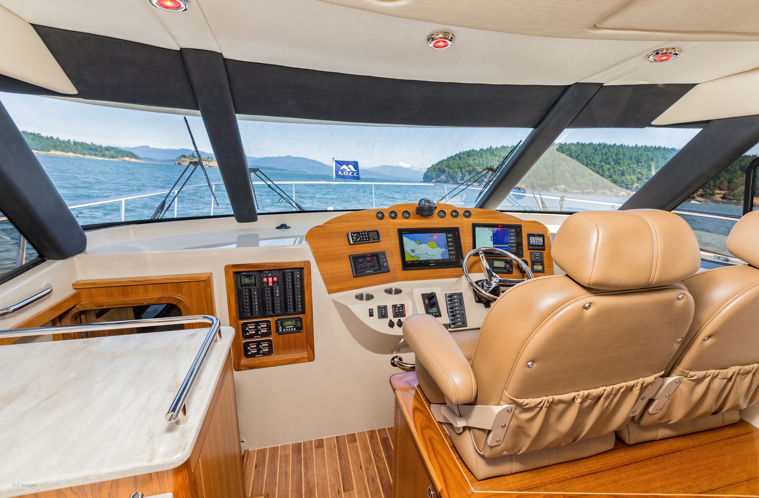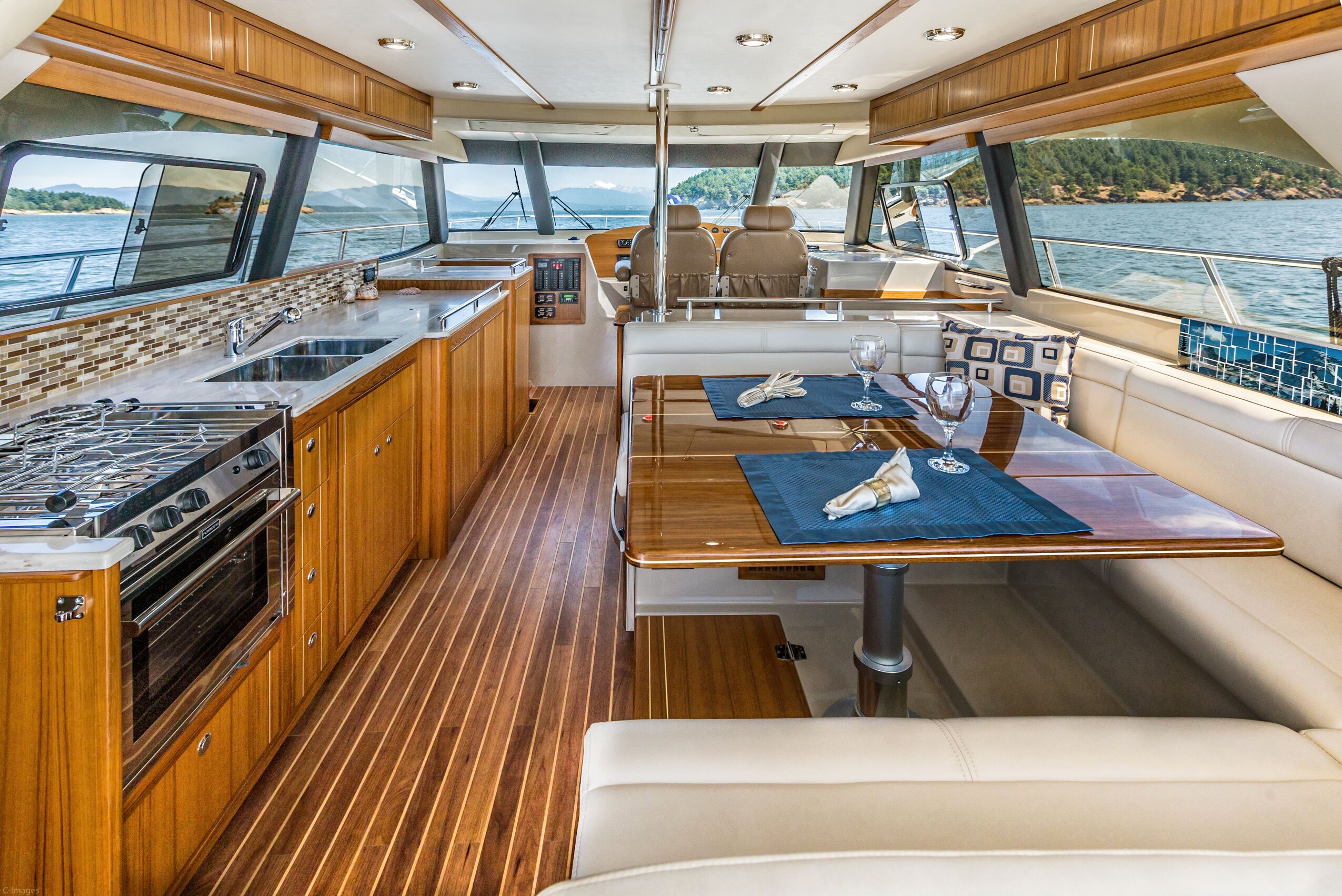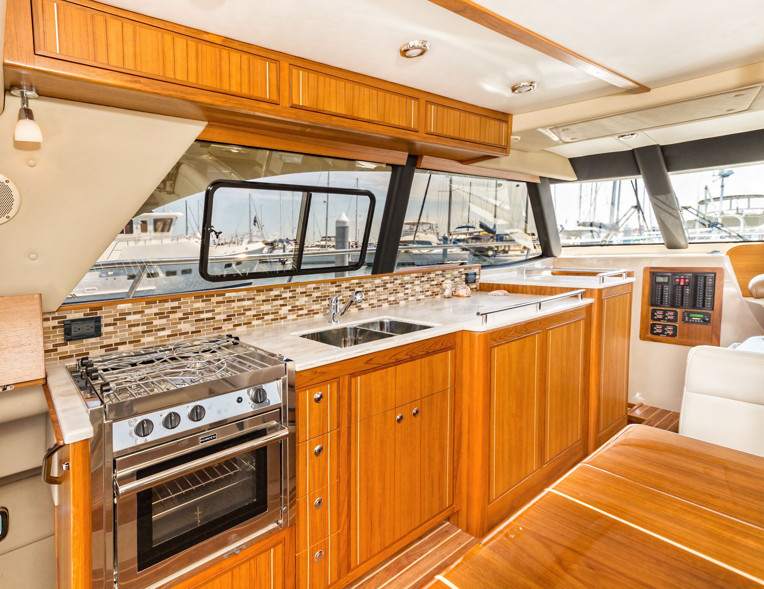 Opposite the galley, a U-shape dinette offers seating for six at a high-gloss teak table, which raises and lowers at the touch of a button. Two of the settee seats recline electrically, making the settee equally comfortable for dining and lounging. Additional storage is below the settee. Forward of that is the primary helm station. Sightlines are excellent in every direction, and the molded-fiberglass console holds a bevy of optional Garmin electronics: Engine instrumentation, VHF radio, and vessel controls are all in good sight.