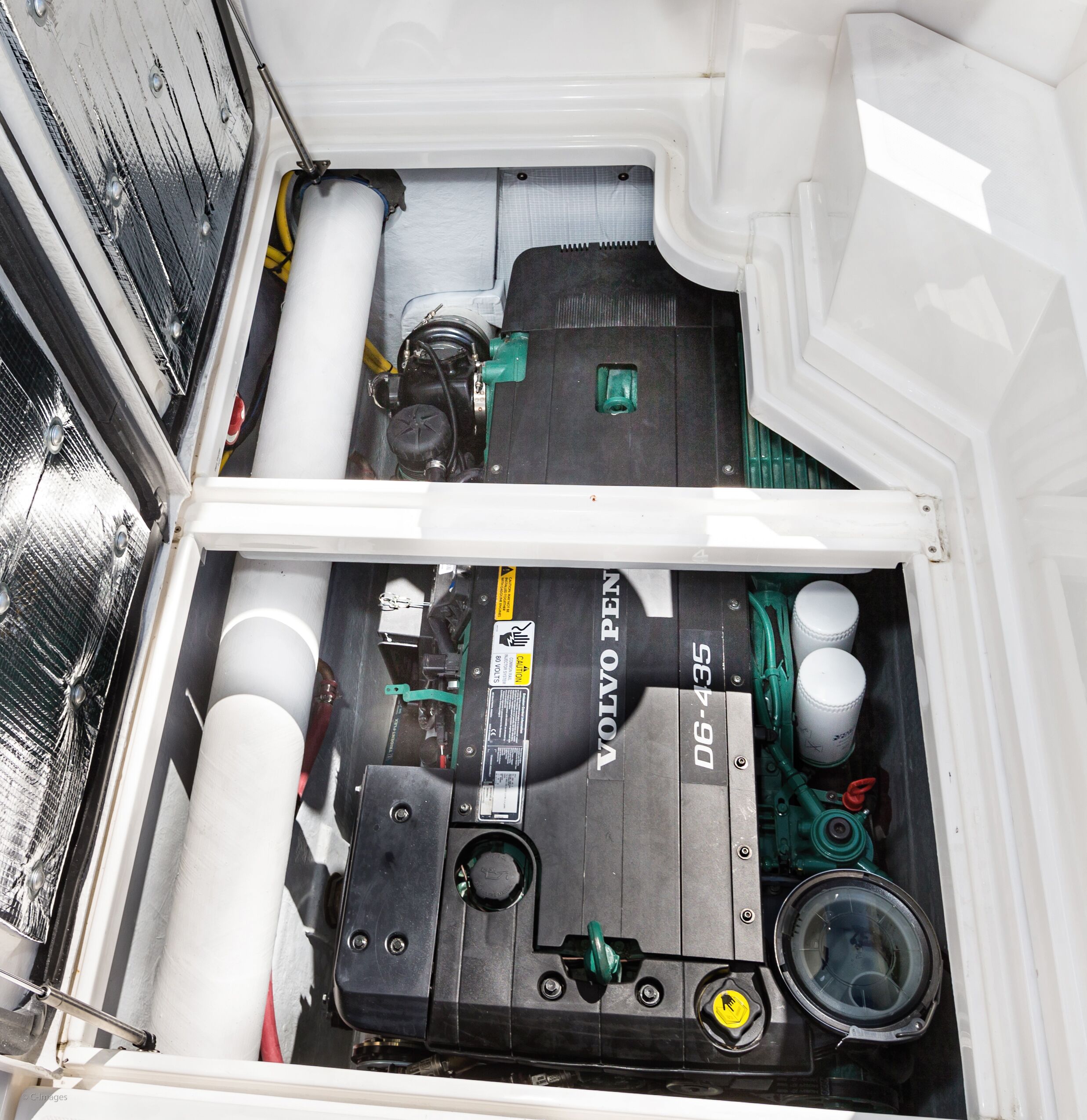 The Volvo Penta D6 is hidden beneath three hatches on the starboard side of the cockpit. Our test boat had the optional 435-horsepower version of the D6, a modern, common-rail diesel that is both turbocharged and supercharged. Volvo’s 330-horsepower D6 is standard, but both powerplants are mated to a V-drive transmission. Equally important, the dipstick, oil, fuel filters, belts, and other service points are all easily accessible.