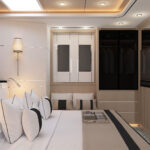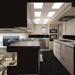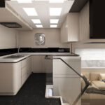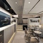 The standard layout on the B72 offers three cabins and a full-beam owner’s suite in the forward section, but the boat can also be configured with five or six cabins, with or without crew quarters. All staterooms are located on the lower deck, where they are isolated from engine noise by steel bulkheads and soundproof barriers. On the main deck, there is a salon, galley and pilothouse with panoramic windows. There is a second helm station on the flybridge that is covered by a hardtop. The flybridge also has room to accommodate two tenders, launched via a hydraulic crane.