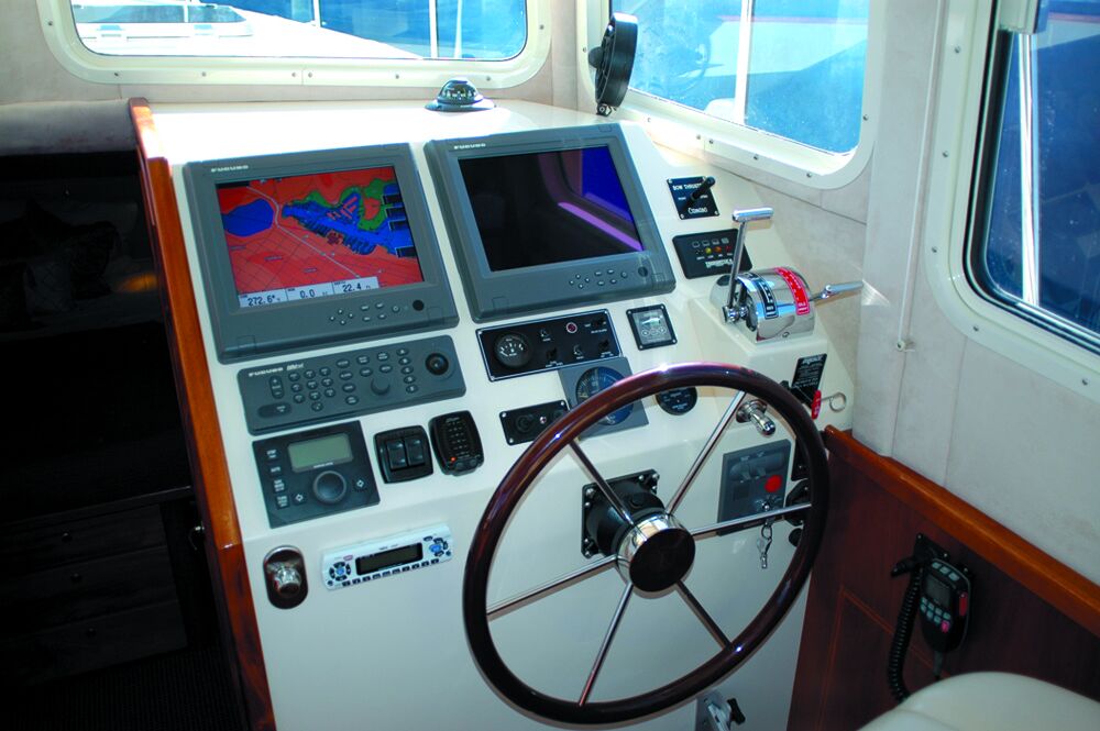 Camano buyers will select an electronics package as part of commissioning. Miller installed a Furuno NavNet system on the demonstration boat and a pair of 12-1/2-inch monitors—for plotter, radar, depth sounder, and other information displays—directly ahead of the helm where they are easy to see. Less critical controls—the Simrad AP25 autopilot and trim tabs, the tachometer, and engine gauges—are arrayed below the monitors. They are in sight, but not obtrusive. This is the way helm instruments should be arranged. Matching navigation gear was installed at the flybridge helm.