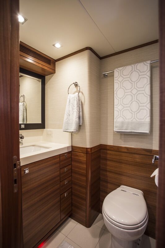 Separate access points to living quarters lie fore and aft. The after cabin—also the master—is accessed just to starboard after entering the saloon. At the bottom of the curved staircase, an athwartship berth lies abaft an en suite head. Due to the adjacent engine room bulkhead aft, there is some engine rumble in the cabin when underway (this while the boat was running at full speed), but not an unforgiving amount. For every other space on the boat, engine noise is well-mitigated.