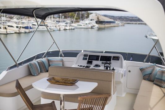 As all-new tooling was developed for the 59, other design features were well-considered. Molded-in lifering pockets and similar carve-outs for dual wing doors make for a smooth tour of the exterior, with full walkaround decks, a sunpad forward, and a dual-level aft deck and cockpit. There is nothing skimpy on this boat, and that extends to the exterior stainless: all rails, handholds, hawse pipes, and cleats are oversized, and decks are wide enough to be useful while not compromising too much girth in the saloon.