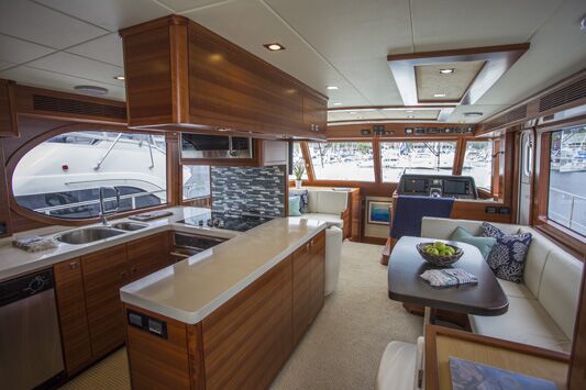 Steve ZimmermanAfter returning to the docks, we took a closer look onboard. Impressively, even after a 45-minute run up and down the coast at 20 knots, the engine room was warm rather than oven-hot, allowing five adults comfortable standing room. Jim explains that the reason for the moderate temperatures is due to a trick they learned when Nordhavn built their 120-foot megayacht. Engine room air intakes bring in heaps of fresh air from the topsides of the hull, but are routed up and over the deck, keeping the space dry and relatively cool. Fly-by-wire hydraulic steering and twin Cummins QSM-11s (rated at 715 horsepower each) complete the package, making for one of the more impressive engine rooms I’ve seen on a yacht this size. The engine room is accessed is from a full-height door from the lower cockpit (clearly visible in the photos).