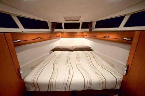 The layout is what one would expect in a boat this size, with the master in the bow, and a combined head with shower to starboard. An interesting design feature is that