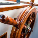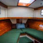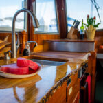 As for a low point, Eric describes heading down to the barn in freezing temperatures, with two pairs of gloves on, endlessly sanding, scraping, sawing. Though I never sensed that he despaired in the work, the progress was slow, and that in itself can encourage the onset of doubt. But here, as we sit in the salon as the boat jostles lightly in her slip, those faint doubts are just memories and all that is left is a custom piece of art, gleaming under fresh coats of varnish.