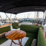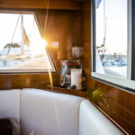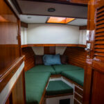 Jonathan CooperFor other personal touches, Kim discovered that a hoop from a whiskey barrel made the perfect frame for a mirror in the master head. They also stain-tested a number of light-colored fabrics determining the right shade to complement the dark interior wood. The only other significant alterations they made were adding flybridge and salon furniture built-ins, as well as changing the master cabin to reorient the berth athwartships.