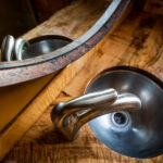 In the head off the master stateroom the Paulsens replaced the mirror with a custom piece made out of whiskey barrel ring that Kim had come across.