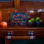 A colorful piece of artwork in the galley that loosely translates to “Splinters Home of Bar and Grill”