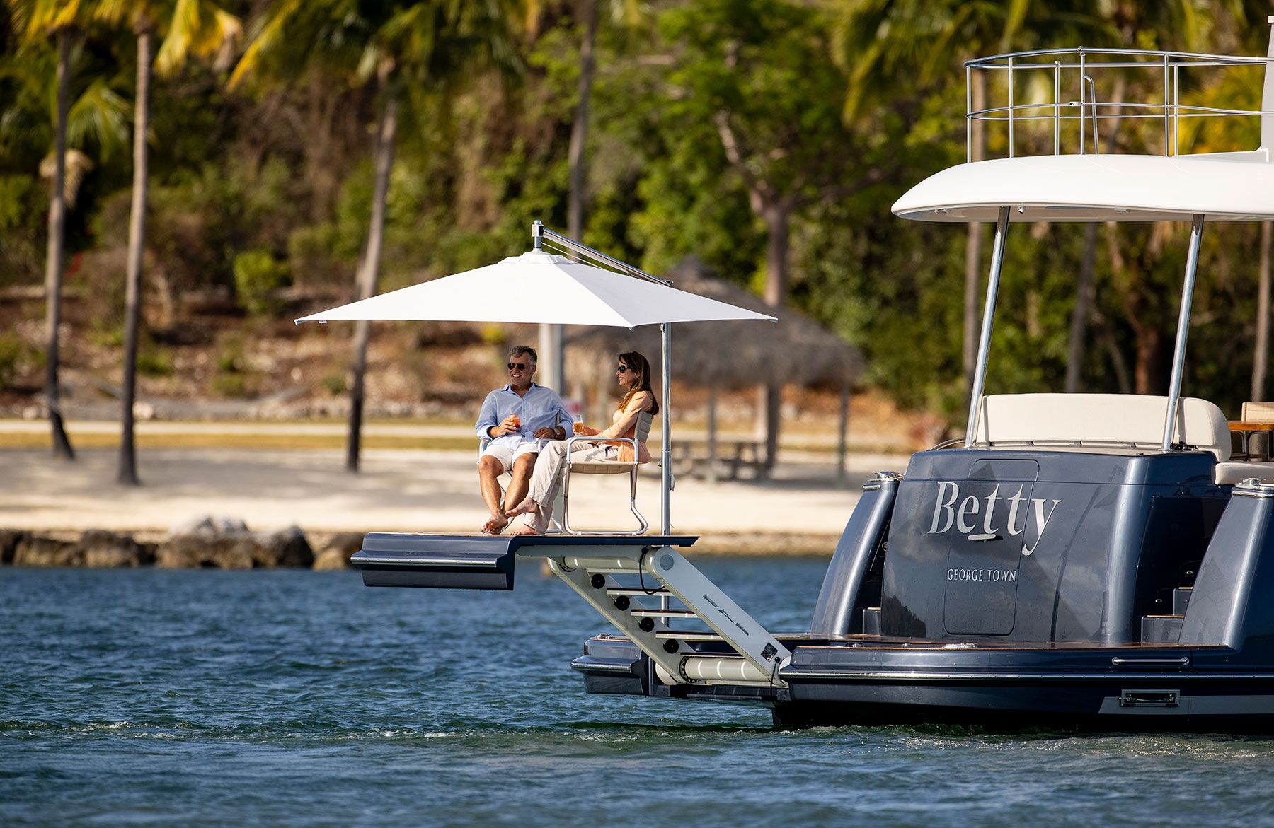 From the salon, a teak door accesses the teak-planked aft deck, which has fender stowage, an electric grill, a bar, a sink, a refrigerator and an ice maker. The upper-deck overhang shields a teak table and settee for eight. Flanking teak steps access the 7-foot-long lower transom platform, which is home to a passarelle, integral swim ladder and inflatable tender with an outboard motor.
