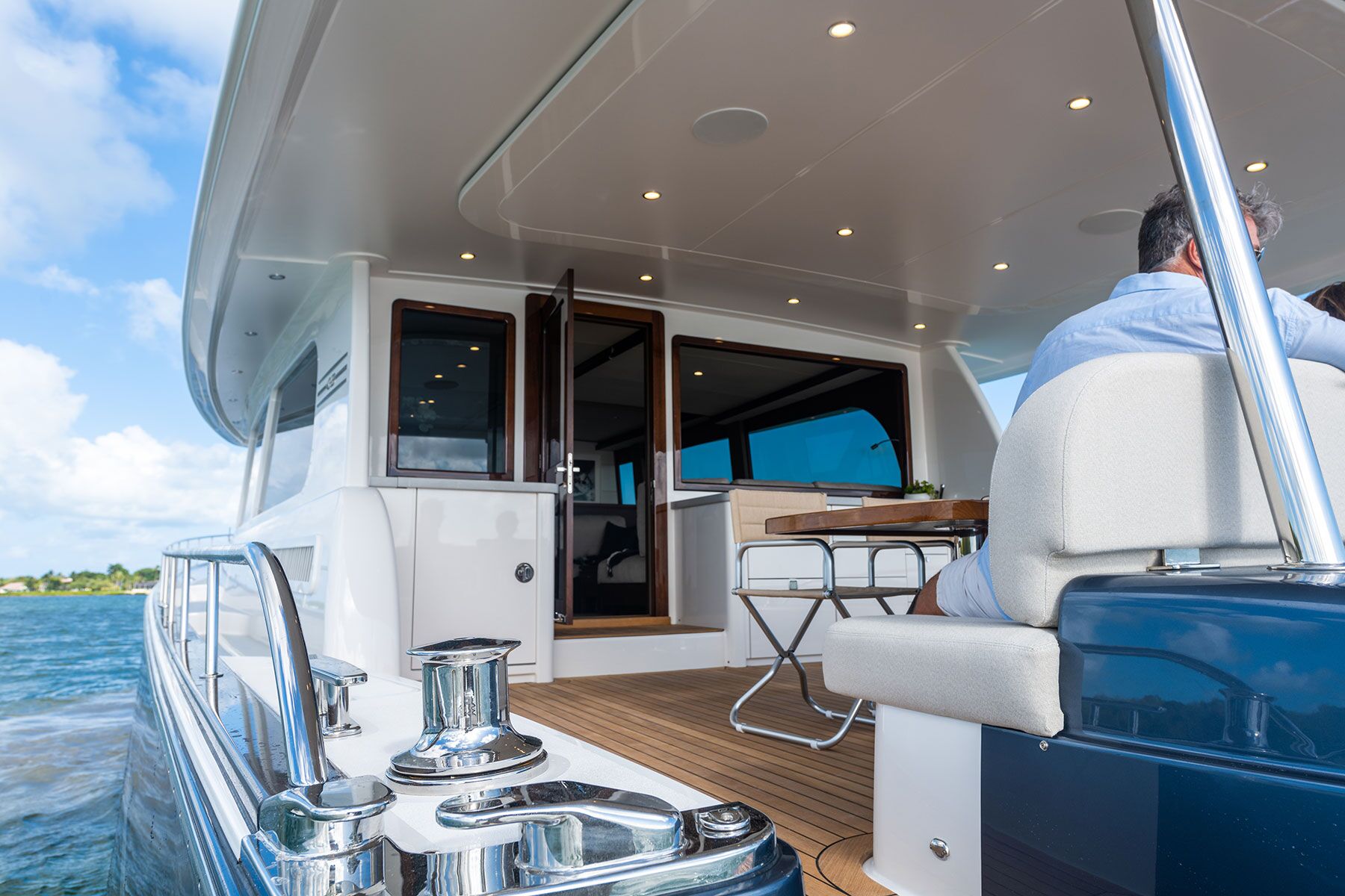 ONNE VAN DER WALThe Skylounge layout utilizes most of the 22-foot, 2-inch beam. There is seating for three in the helm area, two steps above the carpeted sole. Abaft the helm, an L-shape lounge and cocktail table are opposite a Silestone counter that holds a stainless-steel sink, refrigerator, dishwasher and Jura coffee machine. A teak door leads outside to another service area with a Kenyon electric grill, a second refrigerator and an ice maker. The hardtop overhang partially covers a lounge and teak dining table. The 2½-inch toerail and a polished, 29-inch-high, stainless-steel rail provide security on the outside deck.