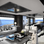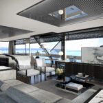 The interior of the 78-footer is where she differs most from her brethren, as the boat will not be equipped with a lower helm station. The builder says this opens up the space for entertainment, allowing them to add a massive galley, with multiple entertainment areas that take advantage of her 21-foot, 3-inch beam. A “loose furniture” concept gives owners the ability to change her look by moving ottomans and settees throughout the salon. An elegant, curved staircase provides interior access to her flybridge; there’s also access from the cockpit, where wide side decks lead to a well-equipped foredeck where a massive sunpad is flanked by tables and accompanied by a pair of L-shaped settees.