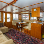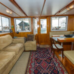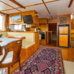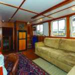 Irresistible III was built to be a comfortable long-range coastal cruiser with generous accommodations, yet still be safe to move around when underway. This was accomplished with well-placed handholds throughout the boat. For a boat only 43 feet in length on deck, it has nicely sized living spaces. Taking advantage of the port side being pushed out to the beam, the main saloon has a width of 15 feet. The master stateroom, nearly 12 feet long, starts at the full beam width and only tapers toward the bow. The pilothouse is over 12 feet wide and deep enough for a comfortable watch berth and two helm chairs. They have two large heads, unusual for a single stateroom boat, but a great marriage saver for a couple living aboard. Headroom throughout is a full 6 feet 4 inches. The well-thought-out spaces have proven easy to live in and easy to maintain. A talented artist, Marie-Anne especially likes that the pilothouse can convert into an art studio, saying it has the perfect light for painting.