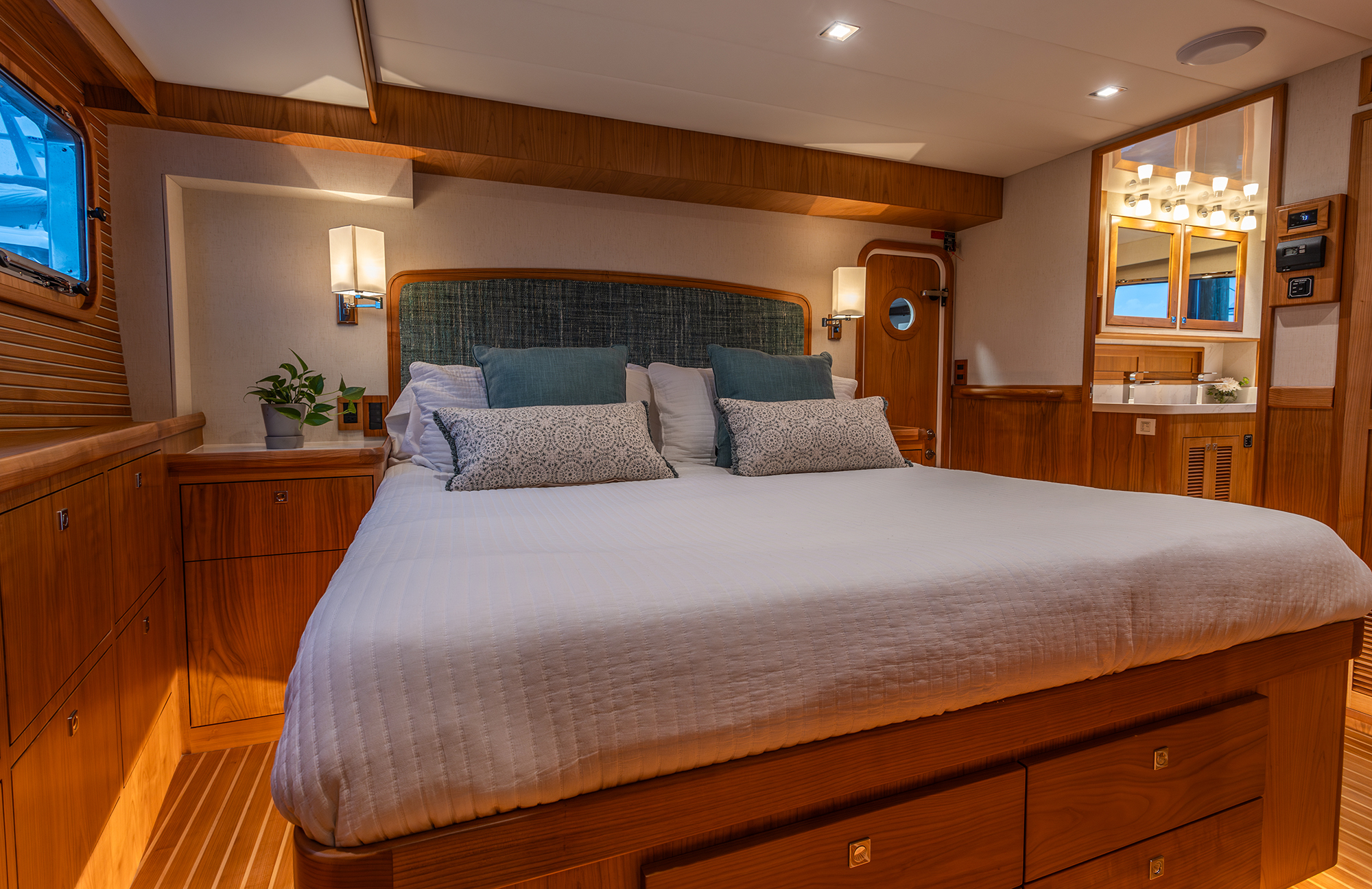 Accommodations are equally spacious. The amidships, full-beam master has an island king berth, hanging lockers, a bureau, and a head with a shower and twin sinks. Oversize rectangular opening ports feel more like picture windows. The VIP stateroom in the bow has an island queen, a head with a shower, drawers and a hanging locker. Stowage is a particularly strong point throughout the boat.
