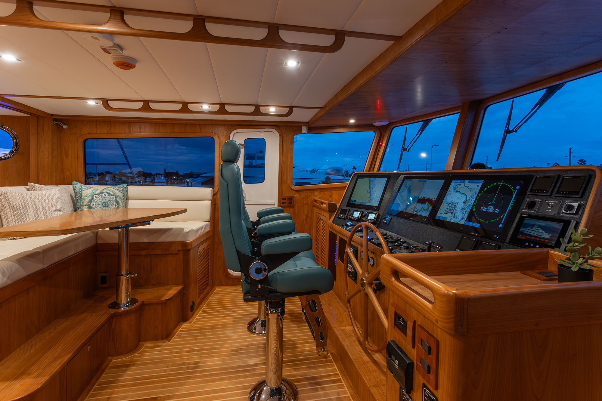 A retractable slider extends out from the cabin wall to the TV, effectively separating the bridge deck and the salon should the helmsman want relief from the party or gaming teens. Up a single step, the centerline helm shares space with a sofa, a cocktail table and a day head.