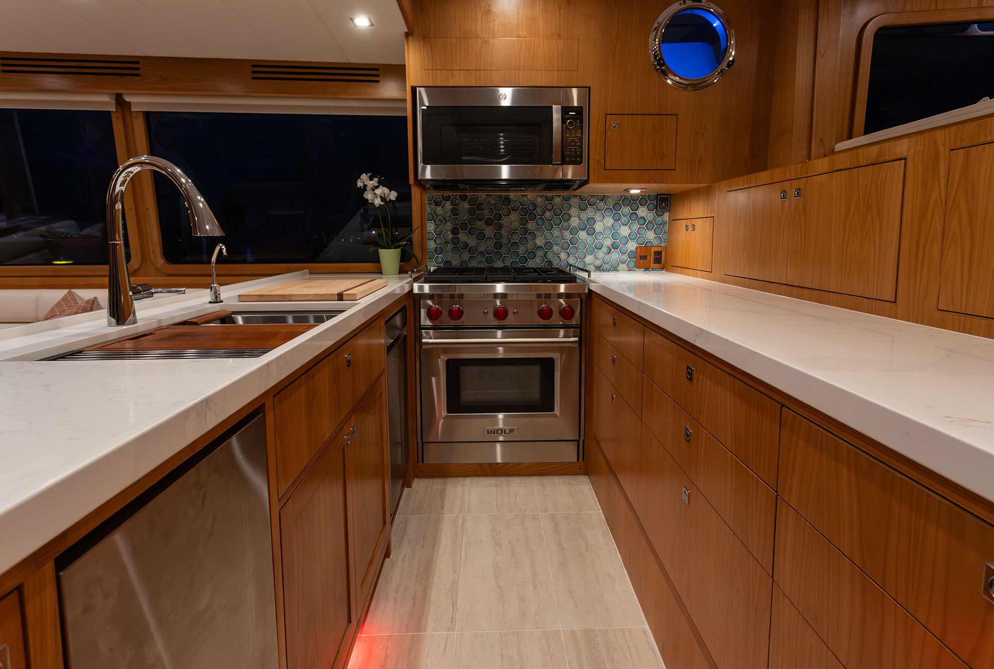 The main-deck salon has space for small-group entertaining. The adjacent galley is fitted with a 30-inch Wolf stove and oven, a deep single-basin sink, a GE microwave, a full-height side-by-side Sub-Zero refrigerator/freezer, and a wine chiller. A clever “appliance garage” (or as I saw it, a “blender dock”) emerges on demand from the sprawling Silestone countertop. An electrically actuated TV rises athwartships from the galley backsplash.