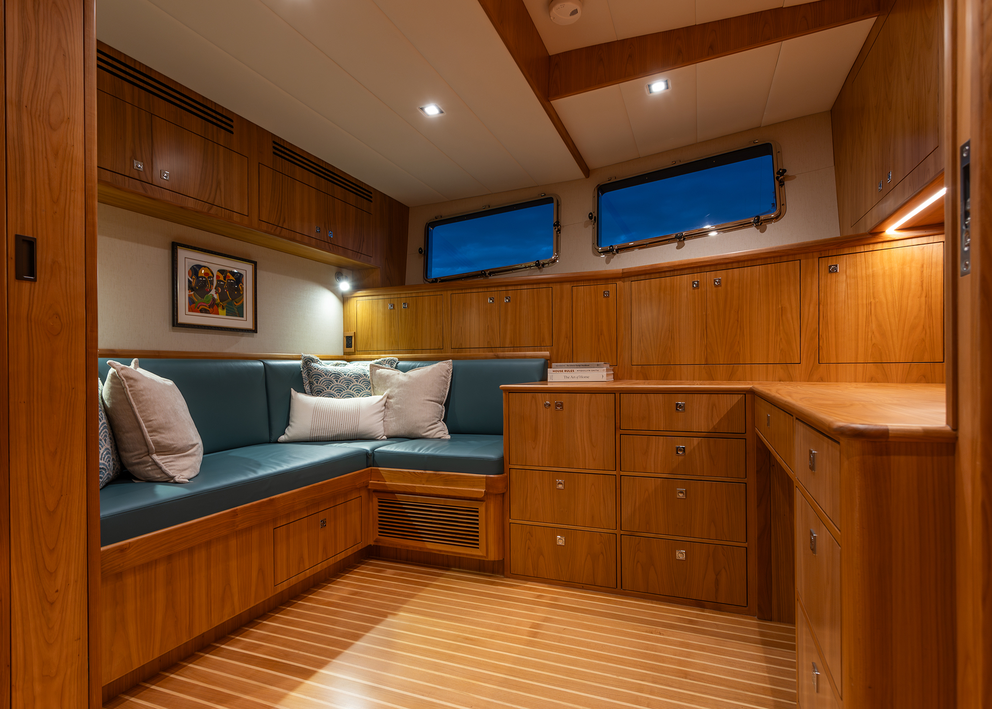 The office on Hull No. 1 is between the VIP and master. It has a settee, a workstation and sliding panels that can be closed for privacy or to convert the space for sleeping. The interior of Hull No. 1 is finished in cherry veneer. Walnut is available, but the cheerier cherry creates a brighter vibe and adds a more contemporary flair.