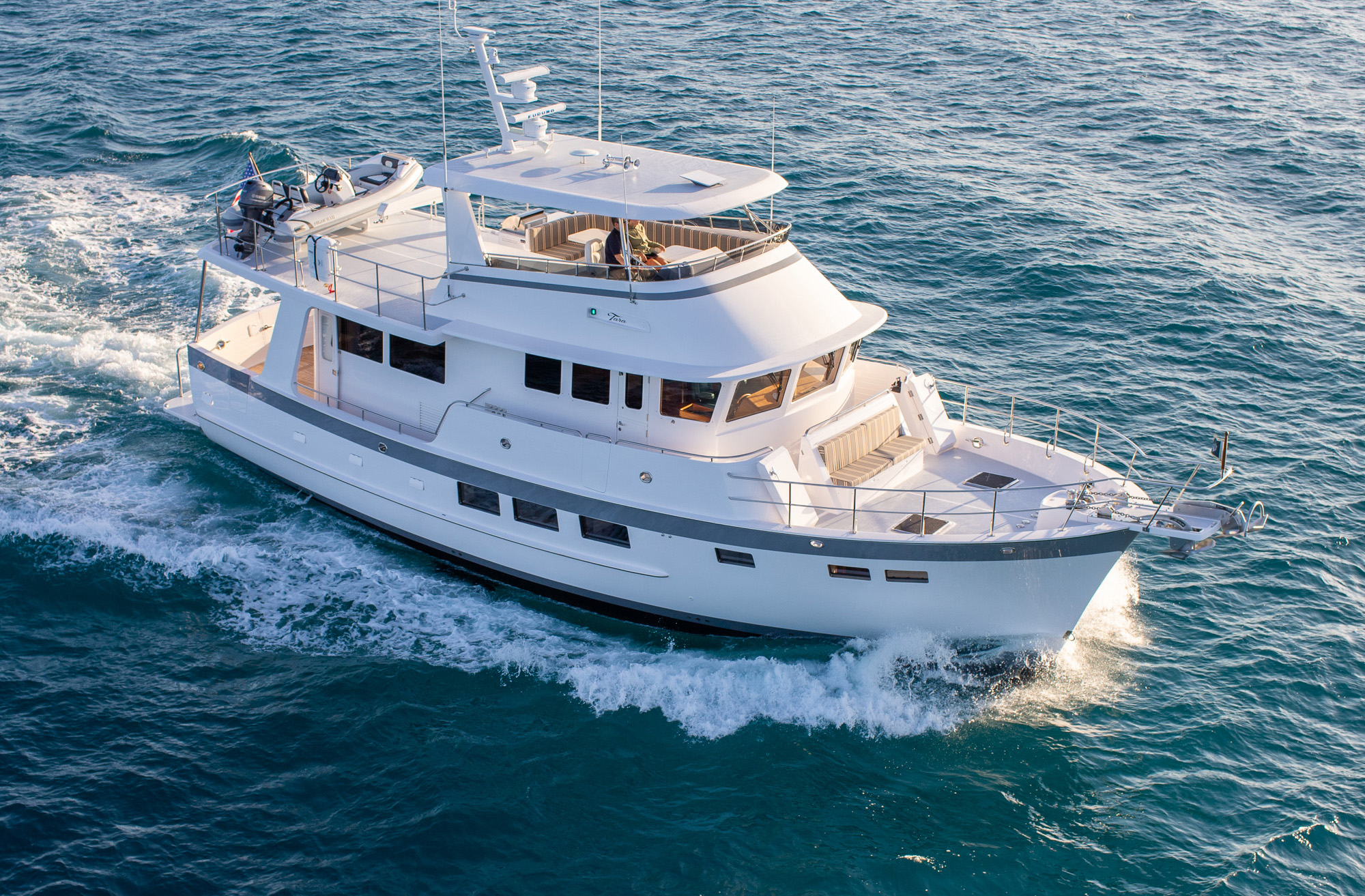 Construction is hardy. The topsides and superstructure are hand-laid Knytex fiberglass with a Corecell PVC sandwich core. Below the waterline, the hull is solid fiberglass with blister-resistant vinylester resin utilized on the first two laminates, with aramid fiber/FRP reinforcements.