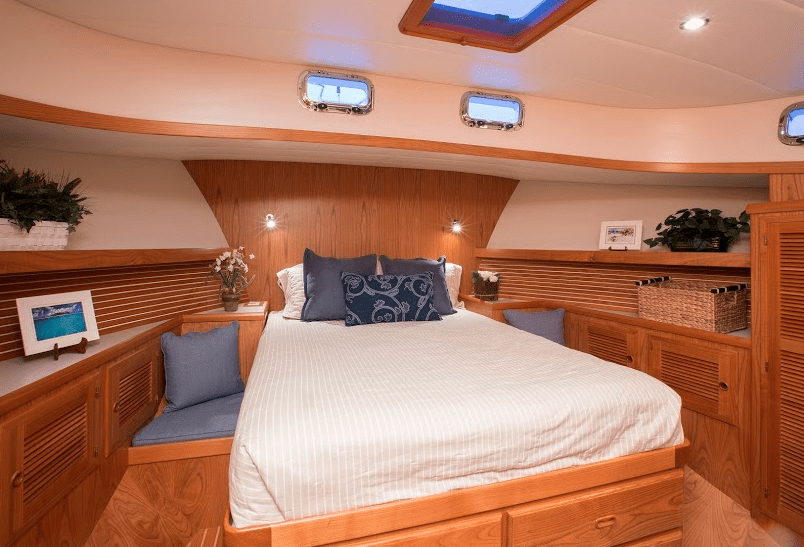 Forward and down from the bridge deck were the two staterooms. The en suite master was in the bow with a queen-size island berth. Abaft it was the guest stateroom, which had a desk, an L-shaped lounge and a Pullman berth.