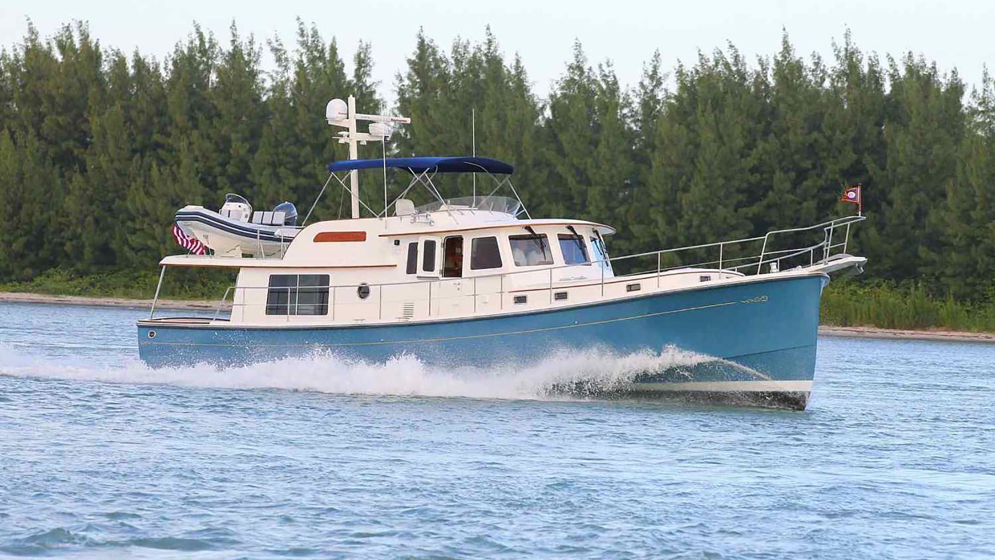 The 52 has the salty, rugged appearance of a trawler, but something about her design also gives her the stylish look of a classic motoryacht. Maybe it’s her sheerline, which rises gracefully to a wide-flare, plumb bow. Or, possibly, it’s the way the cabin house, flybridge and deck lines mirror the cupped shape of the hull.