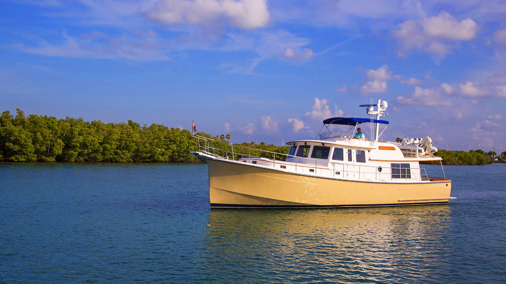 We entered the Intracoastal Waterway at Mile Marker 966 and headed north toward Fort Pierce Inlet. At around 10 knots, the KE52 was quiet and vibration-free. The fuzzy but durable elk hide wrapping the stainless-steel destroyer wheel at the flybridge helm felt good under my fingertips. Teak decking made things comfortable underfoot.