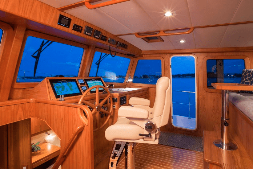Three steps to port of the galley lead up to the bridge deck. For die-hard paper chart and chart book navigators (like me), there was a starboard-side chart table with twin chart-size drawers beneath it. Just to port was the helm, with a wheel fashioned from solid teak. There’s space for dual multifunction displays and engine instrumentation, and the captain’s chair swiveled. Doors on either side opened to the side decks. Abaft the helm was an elevated bench and a teak table, near steps that lead up to the flybridge.