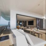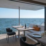 The standard layout has three double cabins with private showers. Comprising two deck levels, the owner’s cabin spans the trimaran’s entire starboard side. A bed and office are on the main deck level, with sweeping views over the water. The bathroom with separate shower can be reached by a few steps down to the hull’s lower level.